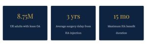 Unlike steroid injections, HA takes up to 4 weeks to reach full effect — but the benefit lasts considerably longer. Clinical evidence shows HA can provide pain relief for up to 12–15 months from a single injection. A landmark meta-analysis published in the Osteoarthritis and Cartilage journal found HA delays the need for knee replacement surgery by an average of 3 years.